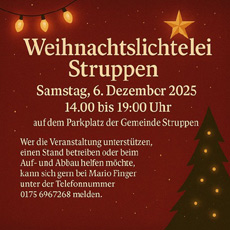 Auch in diesem Jahr laden wir herzlich zur Struppner Weihnachtslichtelei ein. Am Samstag, den 06. Dezember 2025, verwandelt sich der Parkplatz an der Gemeinde Struppen in einen stimmungsvollen Weihnachtsmarkt. Von 14:00 bis 19:00 Uhr erwarten Euch Glühwein, frisch gebackene Waffeln und handwerkliche Kostbarkeiten.